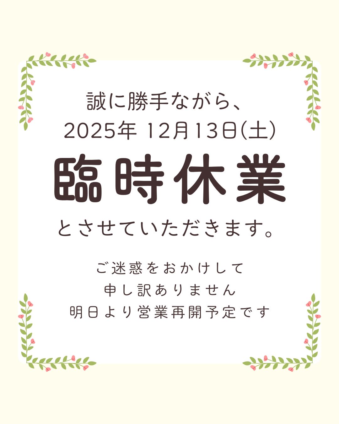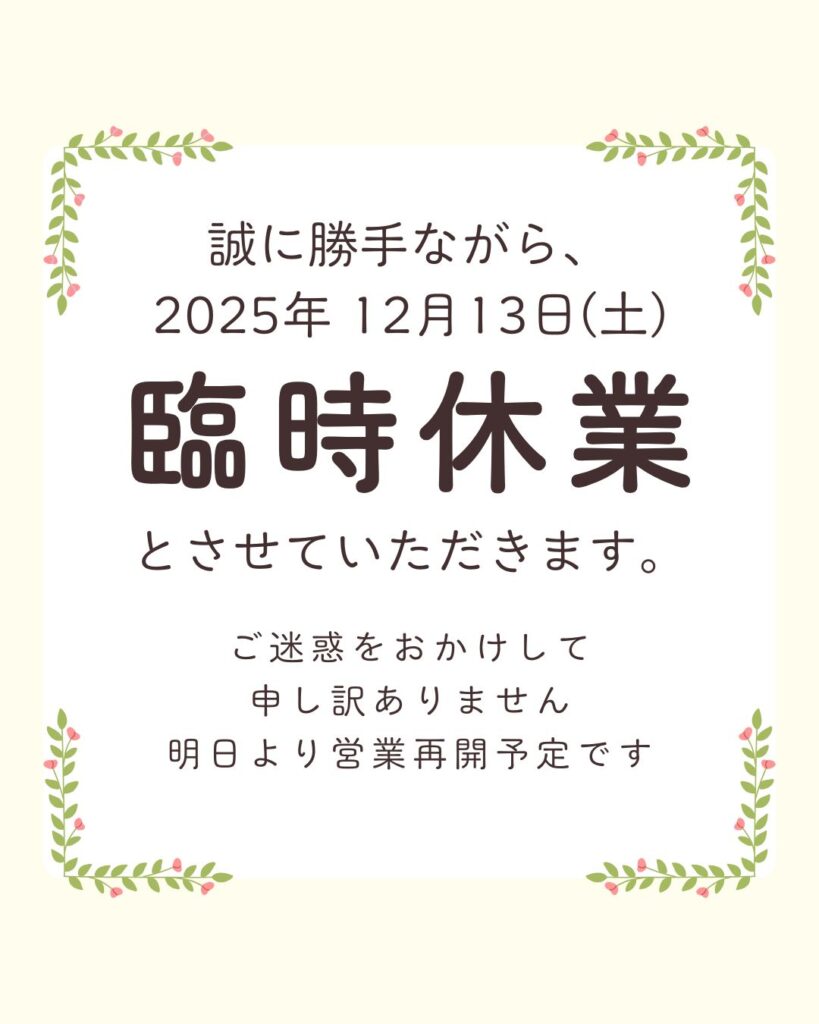 12月13日(土)臨時休業のお知らせ